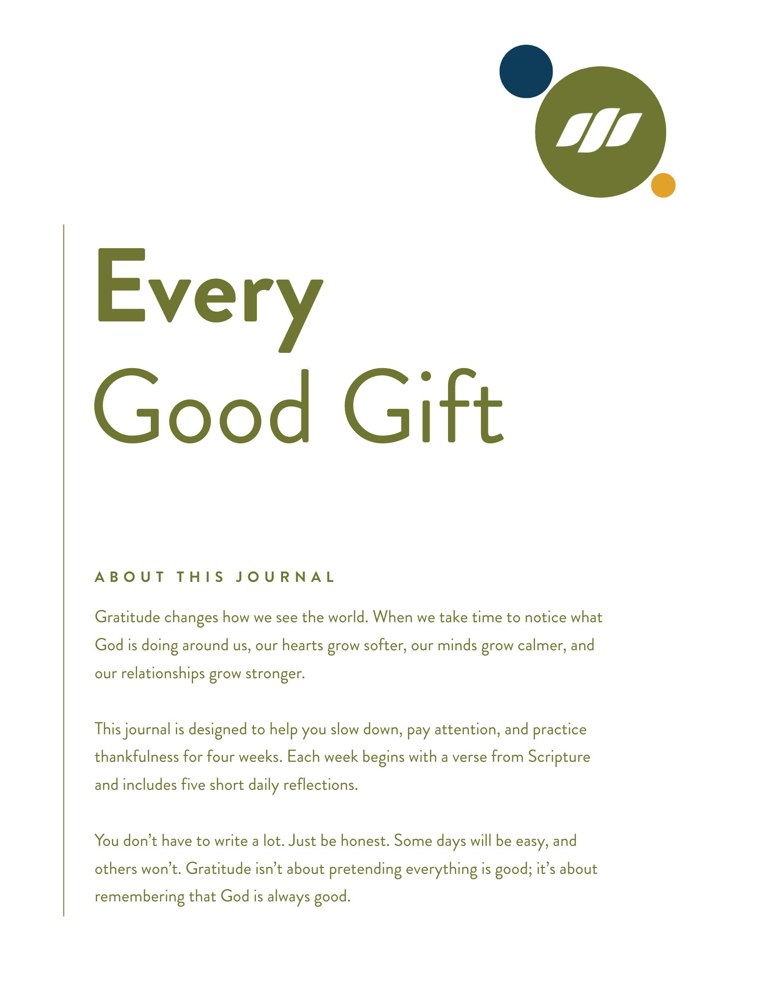 This journal for students is designed to help them slow down, pay attention, and practice thankfulness for four weeks. Each week begins with a verse from Scripture and includes five short daily reflections.