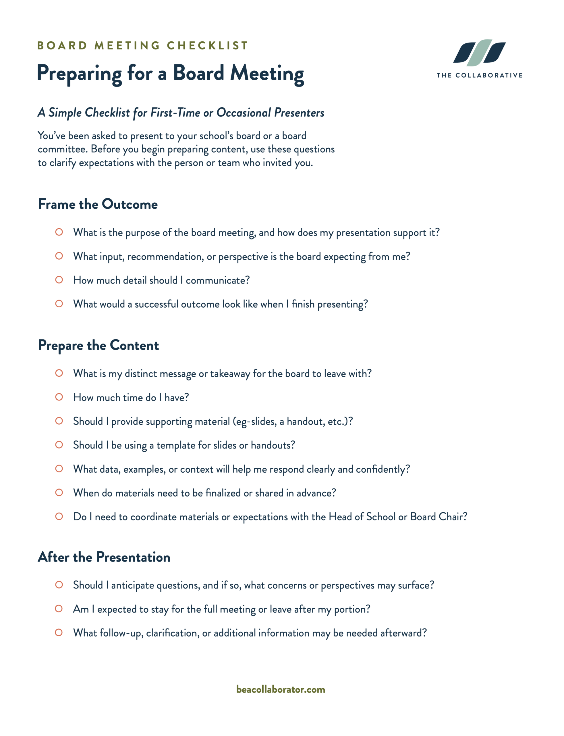 You’ve been asked to present to your school’s board or a board committee. Before you begin preparing content, use these questions to clarify expectations with the person or team who invited you.